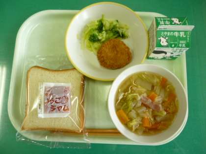 今日の給食は,食パン、牛乳、メンチカツ、野菜のドレッシング和え、はくさいスープ、いちごジャムです。
