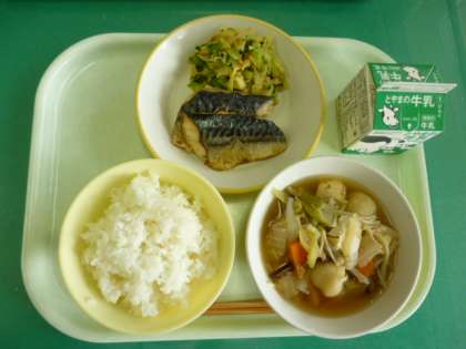 今日の給食は、ごはん、牛乳、さばの塩焼き、いり大豆和え、ちゃんこ鍋です。