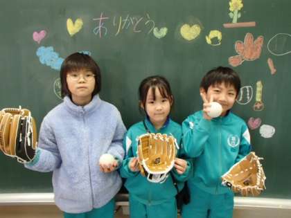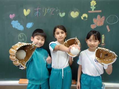 寒江小学校にも大谷選手からのグローブが届き、2年生みんなで、順番にグローブを触ったり手を入れたりしてみました。