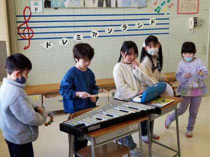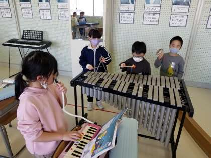 今日は、3グループに分かれて「きらきら星」の合奏を発表し合いました。星が瞬く雰囲気に合うように、楽器の組み合わせや鳴らし方を工夫していました。どのグループも、きらきら綺麗な曲を演奏していました。