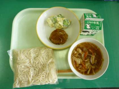 今日の給食は、ソフト麺の五目あん、鶏つくね、ポテトサラダです。