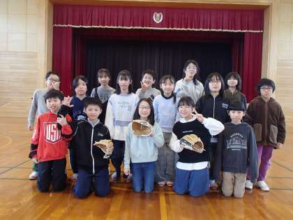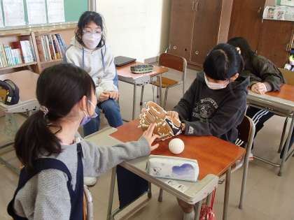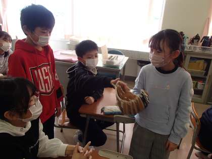 大谷選手から届いたグローブをみんなで見たり、手を入れたりしました。カードやグローブをじっくり見て、友達と気付いたことを伝え合っていました。「もう手を洗えない」と言うなど、大喜びの子供たちでした。