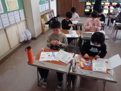 3年生は、算数で三角形の学習をしています。今日は習ったことを生かして、正三角形や二等辺三角形を敷き詰めた「模様づくり」に挑戦しました。