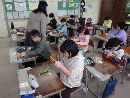 図画工作科の学習では、てん刻に挑戦しています。自分の名前等の文字のデザインを工夫していました。