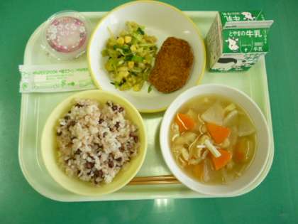 今日の給食は、赤飯、牛乳、とんかつ、コーン和え、みそ汁、さくらゼリーです。