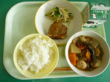 今日の給食は、ごはん、牛乳、魚の甘みそかけ、おひたし、関東だきです。