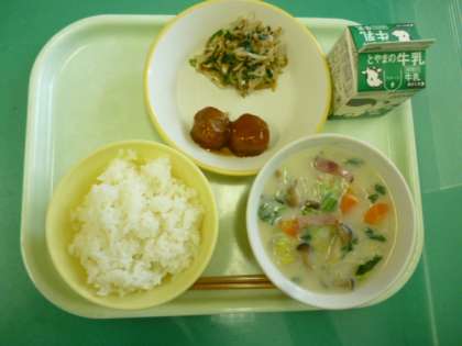 今日の給食は、ごはん、牛乳、肉団子の甘酢あん、ナムル、白菜の中華クリーム煮です。