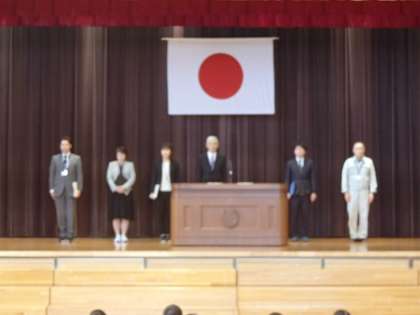 新たに寒江小学校に着任した教職員の紹介の式を行いました。子供たちは、新しい出会いに心躍らせていました。