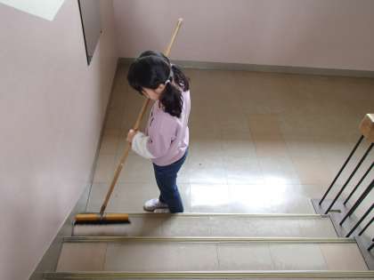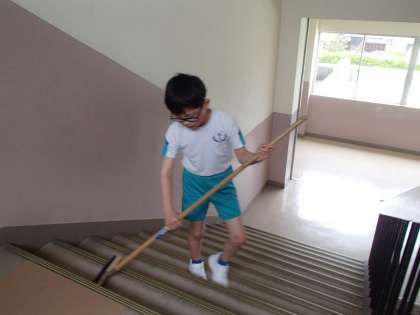 上学年の仲間入りした4年生。掃除の時間には、時間いっぱいできることを考えて掃除しています。
