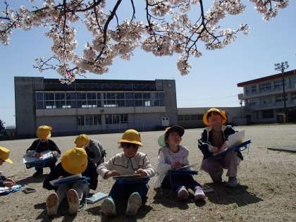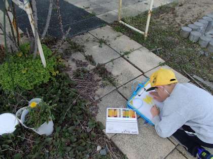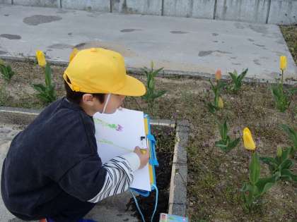 桜やチューリップ等、学校に咲いている花を見ながら絵を描きました。花びらの形や色をじっくり見ながら描いていました。