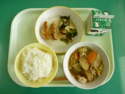 今日の給食は、ごはん、牛乳、焼きぎょうざ、海藻サラダ、肉豆腐です。