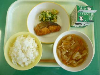 今日の給食は、ごはん、牛乳、魚の竜田揚げ、おひたし、沢煮椀です。