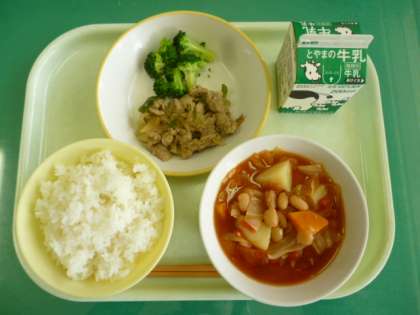 今日の給食は、ごはん、牛乳、ポークソテー、ゆでブロッコリー、白いんげん豆のトマト煮です。