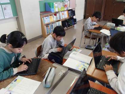 国語科の「白いぼうし」の学習をしています。クロームブックを活用し、疑問や不思議だと思ったことをみんなで出し合っています。