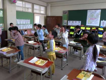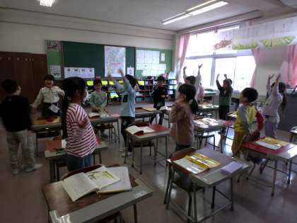 「動きを入れてもいいですか?」「動きたい!」と登場人物になりきって音読しています。全身を使ってお話の様子を表現したり、声の大きさや読み方を工夫したりしながら楽しく音読しました。