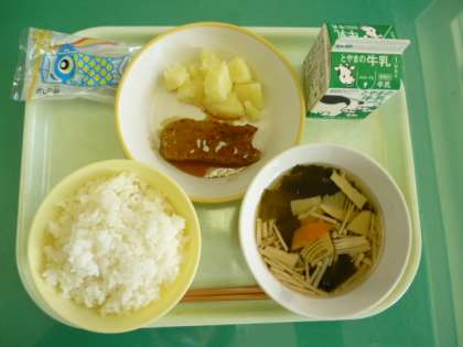 今日の給食は、ごはん、牛乳、鯉のぼりハンバーグ、こふきいも、若竹汁、かしわもちです。