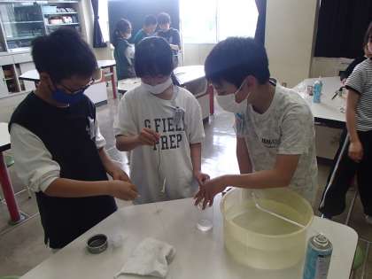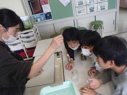 理科の学習では、酸素や二酸化炭素の中で物がどのように燃えるのか観察しました。