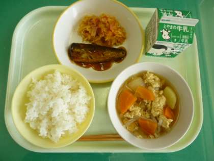 今日の給食は、ごはん、牛乳、いわしの生姜味、切り干し大根のケチャップ炒め、卵とじです。