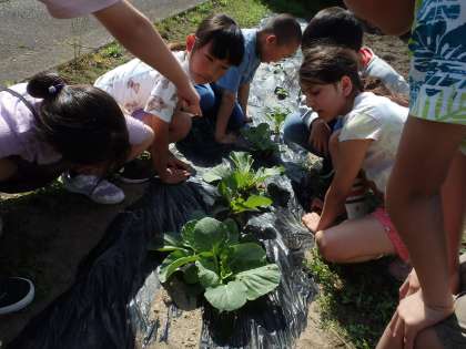 理科の時間に、畑に植えたキャベツを見に行くと、キャベツの葉が虫に食べられていることに気が付きました。葉をよく見てみると、チョウの卵やアオムシを見付けました。