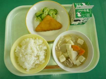 今日の給食は、ごはん、牛乳、はんぺんフライ、きざみ和え、豚汁です。
