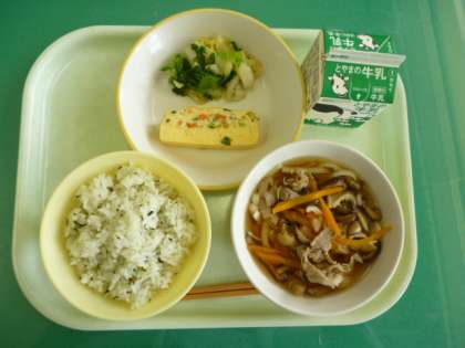 今日の給食は、菜めし、牛乳、千草焼き、おひたし、かやくうどんです。