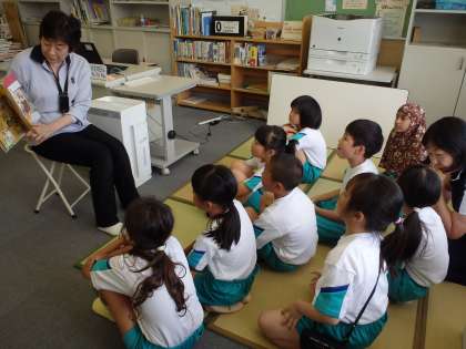 とても暑い中運動会の全体練習をがんばった子供たちにとって、司書の先生の読み聞かせは、心穏やかになる貴重な時間です。今日も、楽しい本を読んでいただき笑顔になりました。