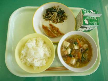今日の給食は、ごはん、牛乳、焼きぎょうざ、小松菜とひじきのナムル、えびと豆腐のうま煮です。