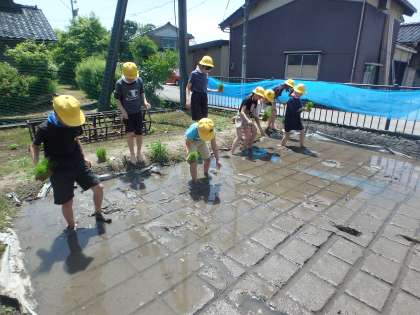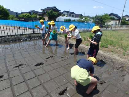 上手にできたのがうれしくて、「ぼく、将来農家になろうかな」とつぶやく子もいました。みんな、おいしいお餅になるように願いを込めて丁寧に植えました。