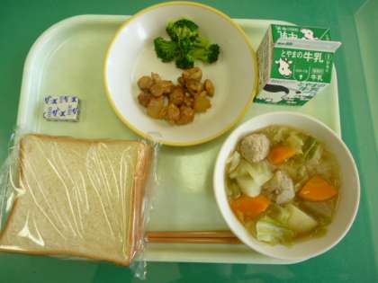 今日の給食は、食パン、牛乳、鶏肉のレモン煮、ゆでブロッコリー、野菜のスープ煮、ポケットチーズです。