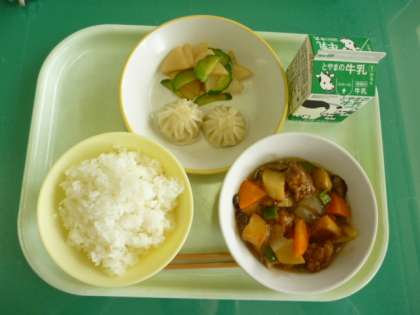 今日の給食は、ごはん、牛乳、えび包子、華風和え、酢豚です。