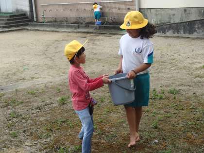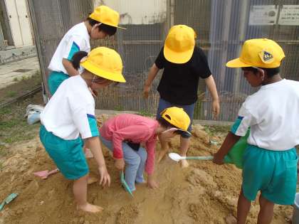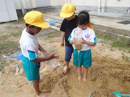 楽しみにしていた「すなとつちとなかよし」の学習をしました。土の感触を楽しみながら、水も使って泥遊びを楽しみました。重たい水を運ぶときには、「助けてー!」「手伝ってー!」と声を掛け合いながら協力して運んでいました。「川ができた!」「見て!滝みたいになった!」とはしゃぎながら、思いっきり砂と土となかよしになりました。
