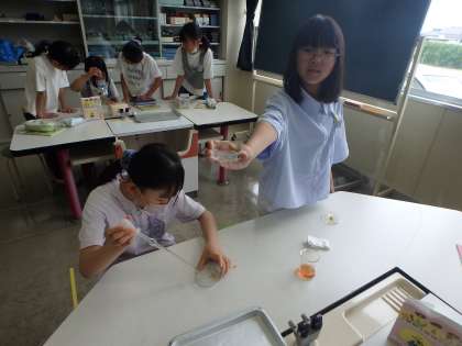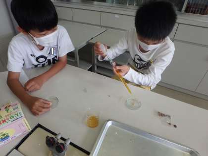 「植物の発芽と成長」の学習では、豆やトウモロコシ、米にデンプンがあるのか、実験をして確かめました。
