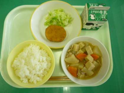 今日の給食は、ごはん、牛乳、コロッケ、ゆでキャベツ、大根のみそ煮込みです。