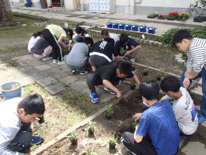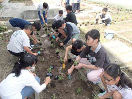 学校の花壇に花の苗を植えました。子供たちは、植える間隔や土を掘る深さに気を付けていました。