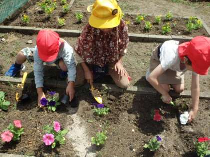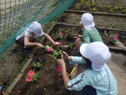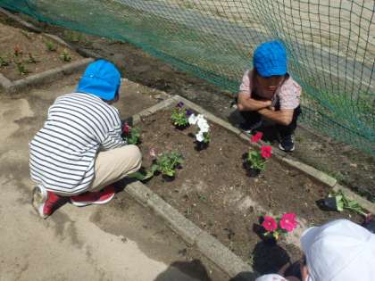 グラウンドの花壇に花の苗を植えました。今年もきれいに咲くように、お世話を続けていきます。