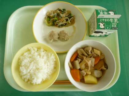 今日の給食は、ごはん、牛乳、肉シューマイ、香味和え、筑前だきです。