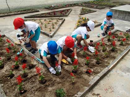 全校花壇の花の苗を植えました。赤いきれいなサルビアです。丁寧にやさしく苗を扱って、6人で40個植えました。きれいな花を咲かせられるように、水やりや除草を頑張ります。