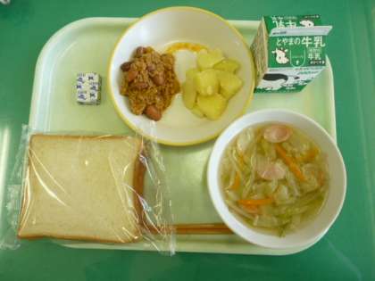 今日の給食は、食パン、牛乳、チリコンカン、こふきいも、キャベツスープ、ポケットチーズです。
