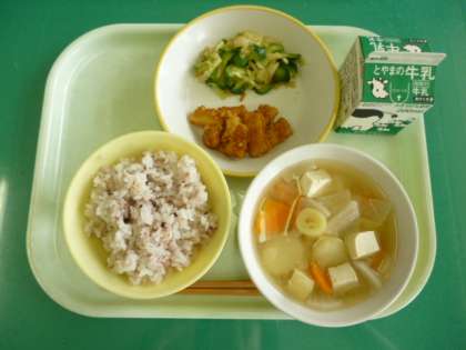 今日の給食は、雑穀入りごはん、牛乳、いかのかりん揚げ、華風和え、すいとんです。