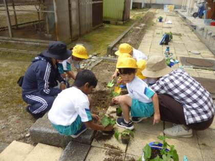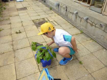 アサガオがぐんぐん育っています。今日は、アサガオが大きく育つように、植え替えをしました。子供たちは、根を傷めないように、注意して土を掘っていました。