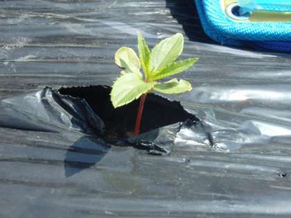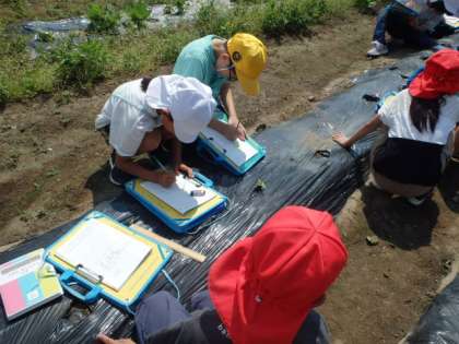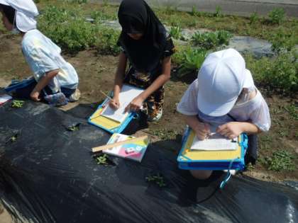 理科の学習で育てているホウセンカとヒマワリに、子葉の次に出てくる葉があるのを見付けました。子供たちは、子葉とは形が違うことに気付き、細かい部分までよく観察し、記録していました。