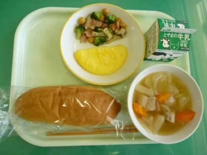 今日の給食は、コッペパン、牛乳、チーズオムレツ、きのこと豆のアヒージョ、ポトフです。