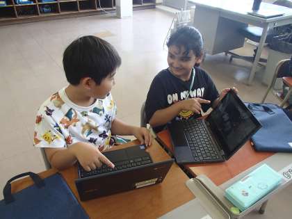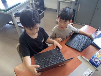 生活科では、学校のお気に入りの場所を紹介する学習をしています。今日はクロムブックを使って、お気に入りの場所を写真に撮り、友達に紹介しました。生き物のたくさんいる理科室や、児童作品コーナー、縦割り班の写真が貼ってある場所が人気のようでした。