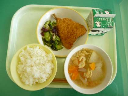 今日の給食は、ごはん、牛乳、あじフライ、海藻サラダ、冬瓜のみそ汁です。