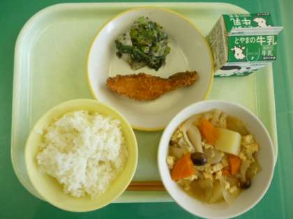 今日の給食は、ごはん、牛乳、魚の竜田揚げ、よごし、卵とじです。