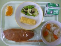 今日の給食は、ごはん、牛乳、さばの塩焼き、チンゲンサイソテー、鶏肉と根菜の煮物、バナナです。