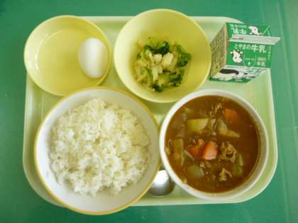 今日の給食は、ごはん、牛乳、カレーライス、ゆで卵、花野菜サラダです。