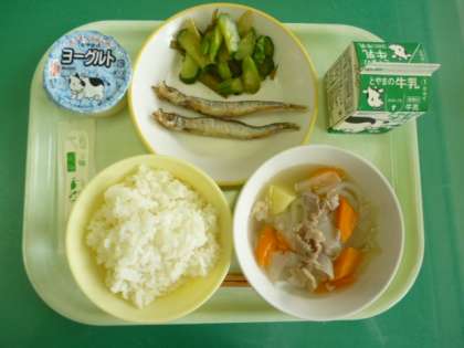 今日の給食は、ごはん、牛乳、ししゃもの米粉揚げ、茎わかめの中華あえ、塩肉じゃが、ヨーグルトです。