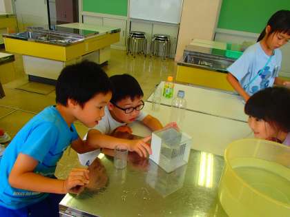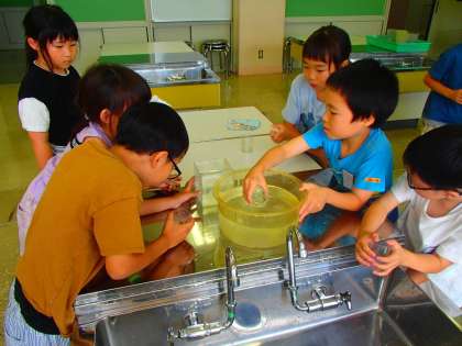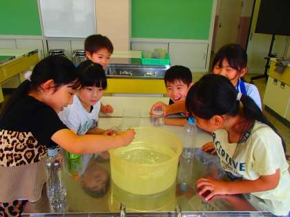 1デシリットルと1リットルのますを使って、水のかさを調べました。家から持ってきたペットボトルにはどれくらいの水が入るのか、グループで予想をしてから実際に調べました。正確に量ろうと、真剣に取り組んでいました。