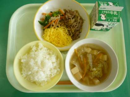 今日の給食は、ごはん、牛乳、ビビンバ(焼肉、ナムル、錦糸卵)、中華スープです。
